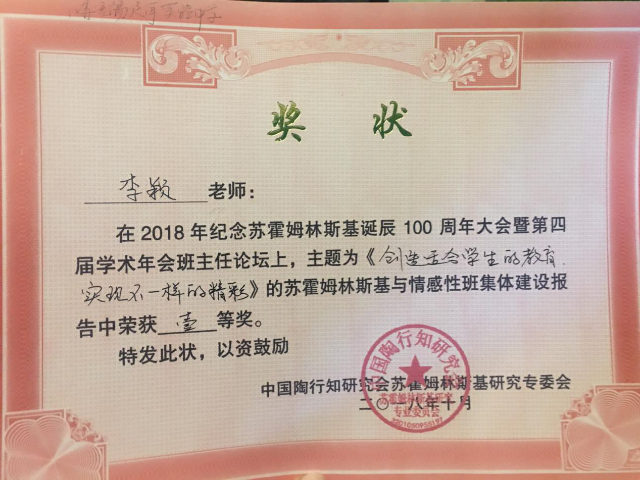 2018102528号,我校德育主任李颖赴郑州参加陶行知研究会苏霍姆林斯基专业委员会在郑州举行的纪念苏霍姆林斯基诞辰100周年大会及第四届学术年会。在会上,无锡市运河实验中学被授予全第一批苏霍姆林斯基教育思想研究示范基地学校。李颖主任参加了全国情感教育与班集体建设论坛,并获得一等奖。会议现场教育界大咖云集,十三届全国政协常务委员兼副秘书长、民进中央副主席、中国教育学会第八届理事会学术委员会顾问、中国陶行知研究会副会长、教授、博士生导师朱永新教授作纪念苏霍姆林斯基诞辰100周年主旨报告《学习苏霍姆林斯基,培育把整个心灵献给孩子的中国教育家》。他深切缅怀了苏霍姆林斯基对教育事业的卓越贡献,以及对中国教育史的巨大影响,希望有更多的老师和教育研究者能够像苏霍姆林斯基一样,把整个心灵献给孩子。
